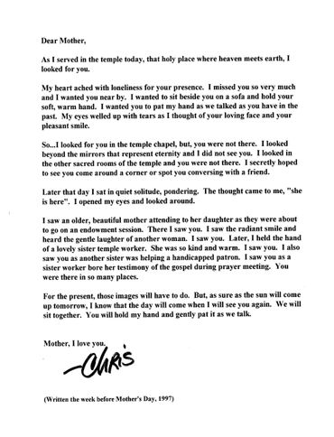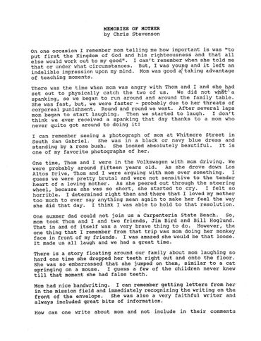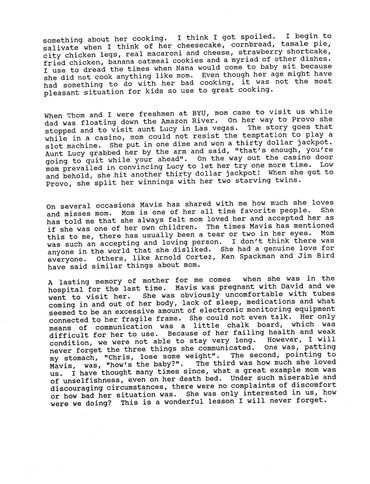 On one occasion, our son Michael was in our bedroom when I arrived home late one night. Mavis was in bed and Michael was pleasantly visiting with her about the events of the day. As I was getting ready for bed, I removed my belt and had a brilliant idea. I put the belt around Michael’s neck and pretended like I was choking him from behind. I whispered in his ear to pretend he was blacking out. Mavis became very upset and instructed me to stop - immediately! Naturally, this only encouraged my misbehavior. Michael was doing a fantastic job of acting out his part. He even collapsed and fell into the closet. By this time Mavis was hysterical. I tried to calm her down by telling her we were just joking and her boy was just fine. Looking into the closet, I said, “Right, Michael? Michael?”
