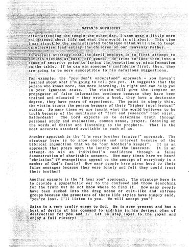 I have thought for a long time how successful Satan has been in getting people to open the door to pathways that lead to greater and greater sin. (By the way, it is also the door to greater and greater unhappiness.) He has had thousands of years of practice and knows every trick in the book. One of his greatest tricks is getting people to explore transgression by enticing them with subtle invitations to what may appear to be harmless, or, at least, not blatant sinful behavior.